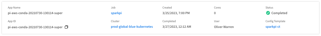 - Core Hours: The core resources used by the application. This metric is calculated as the sum over each container (driver or executor) of its uptime duration multiplied by the number of cores allocated to it.